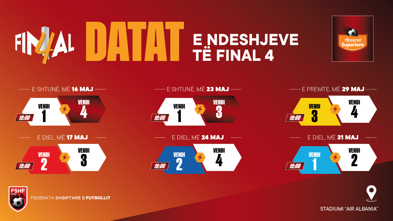 Të gjitha ndeshjet do të zhvillohen në stadiumin “Air Albania”, në periudhën 16–31 maj 2026, duke garantuar një organizim maksimal dhe standarde të larta për fazën më të rëndësishme të sezonit.