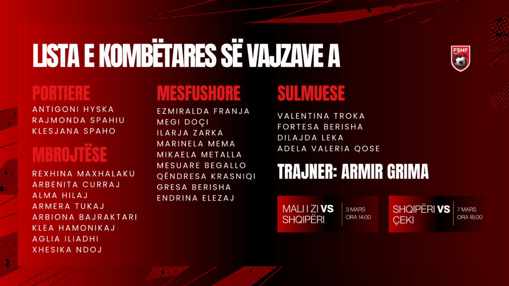 Trajneri i skuadrës, Armir Grima ka ftuar 24 futbolliste për dy ndeshjet e para të muajit mars kundër Malit të Zi dhe Çekisë.