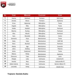 Më poshtë, lista e plotë me 20 lojtaret e grumbulluara nga trajnerja Daniela Kodra.