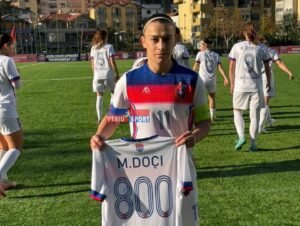 Fotoja që shoqëron shkrimin është bërë pikërisht para ndeshjes së sotme, ku përmes një ceremonie modeste, Megi Doçit i është dorëzuar fanela me shifrën 800.