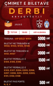 Çmimet e biletave për përballjen mes rivalëve të vjetër të kryeqytetit variojnë nga 500 lekë (tribunat pas porte) në 5000 lekë (tribuna VIP).