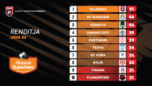 Pas 26 javësh, Vllaznia kryeson me 51 pikë, e ndjekur nga AF Elbasani dhe Egnatia me nga 46 pikë, ndërsa Dinamo City dhe Partizani ndjekin me nga 39 pikë.