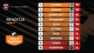 Verdiktet e javës së 9-të të Superiores. Vllaznia humb, por përsëri e para, por tashmë me 1 pikë diferencë me Egnatian e vendit të dytë. Fiton Flamurtari, por përsëri i fundit në renditje