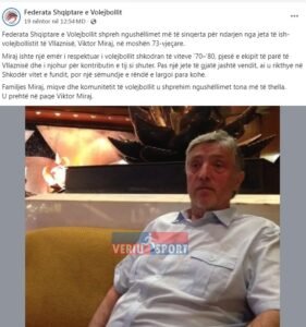 Federata Shqiptare e Volejbollit shpreh ngushëllimet më të sinqerta për ndarjen nga jeta të ish-volejbollistit të Vllaznisë, Viktor Miraj, në moshën 73-vjeçare.