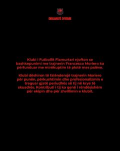 “Klubi i Futbollit Flamurtari njofton se bashkëpunimi me trajnerin Francesco Moriero ka përfunduar me mirëkuptim të plotë mes palëve. Klubi dëshiron të falënderojë trajnerin Moriero për punën, përkushtimin dhe profesionalizmin e treguar gjatë periudhës së tij në krye të skuadrës. Kontributi i tij ka qenë i rëndësishëm për ekipin dhe për zhvillimin e klubit”, – shkruan klubi vlonjat në faqen e vet.